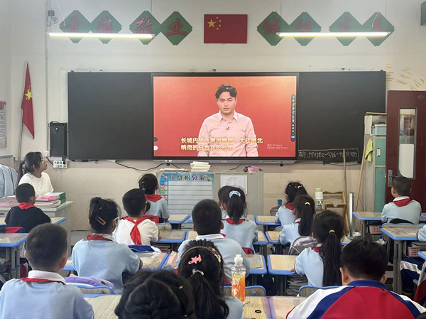 队会课上,全校学生共同观看了小学篇:众志成城的视频。思政教师通过老照片、历史视频片段,生动讲述了抗日战争的背景与经过,还原了革命先辈们奋起反抗的英勇事迹。通过视频及思政教师的讲述,将抽象的历史知识转化为真切的情感认同,让学生们深刻理解了“落后就要挨打,强国必须有我”的道理。
